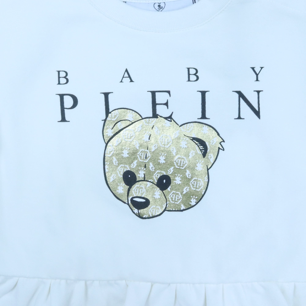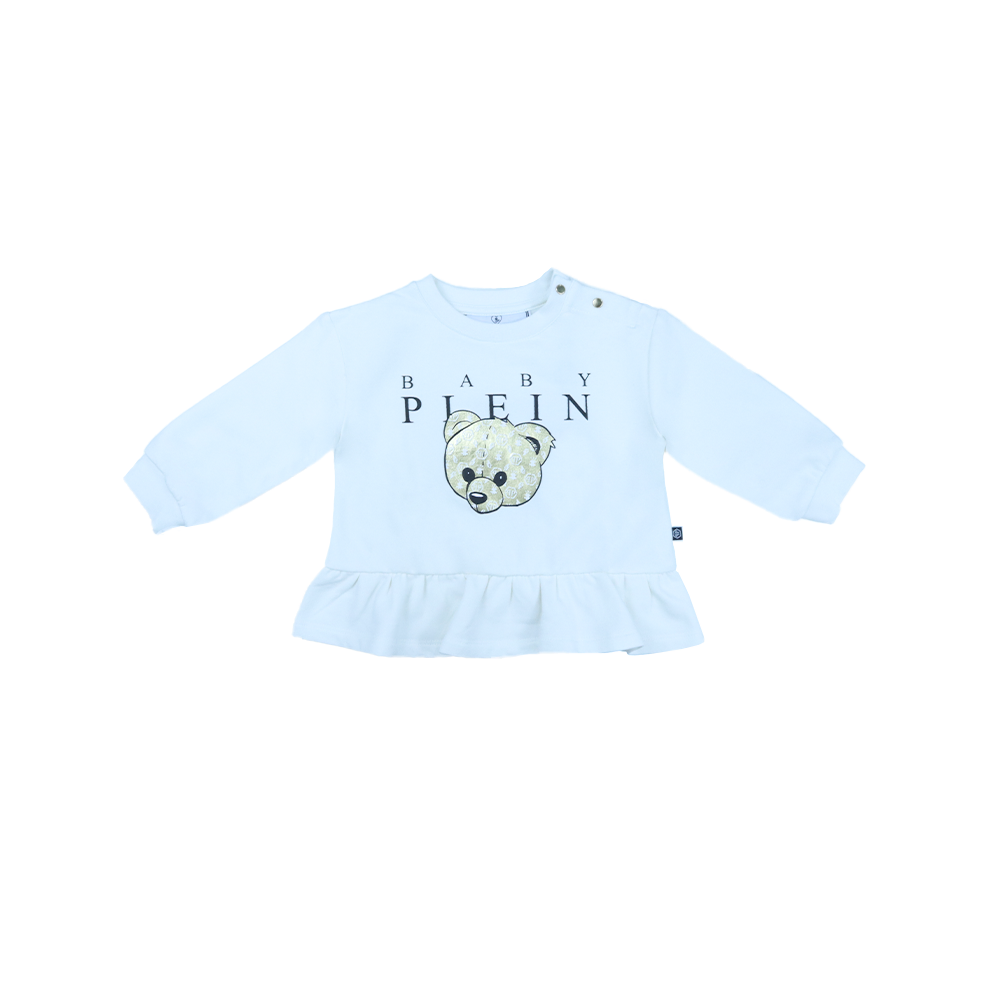 تم تصميم هذه البلوزة الجذابة من Philipp Plein باللون الأبيض مع طباعة دب تيدي مرحة وشعار على المقدمة. تتميز برقبة دائرية كلاسيكية وأكمام طويلة، وتكتمل بحافة متموجة رقيقة تضيف لمسة أنثوية إلى الشكل العادي. مريحة وأنيقة، هذه البلوزة مثالية للارتداء اليومي مع لمسة مصمم ممتعة.