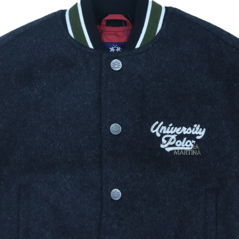 استلهم أسلوب الكلية الكلاسيكي مع هذه السترة الف varsity من لا مارتينا، المصنوعة بدقة من الصوف المغلي للدفء والهيكل. مصممة بياقة ذكية ومزينة بتقليمات مطاطية مخططة باللونين الأخضر والأسود، تمزج بين جاذبية الف varsity الخالدة والأناقة الحديثة. شعار لا مارتينا والكتابة على الصدر، إلى جانب تطبيق العلامة التجارية على الكم، يرفعان المظهر بتفاصيل مميزة. تُغلق السترة بأزرار معدنية مزينة بالشعار لتوفير ملاءمة آمنة وأنيقة. مبطنة بالكامل ومبطنة بخفة، توفر الراحة والدفء مع الحفاظ على صورة ظلية أنيقة، مثالية لزي مستوحى من الأكاديمية.