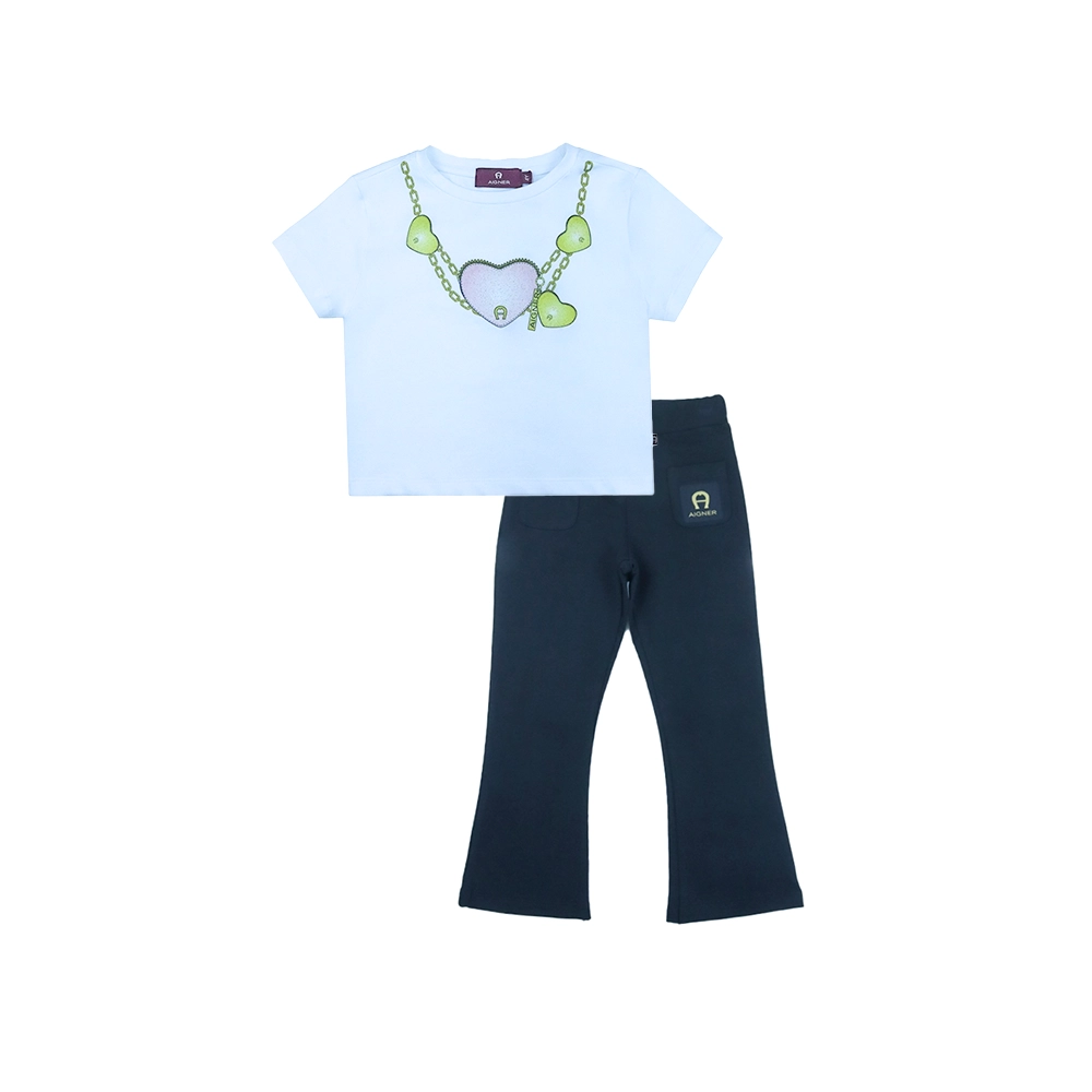 ألبسي طفلتك بالراحة والأناقة مع هذا الطقم الأنيق من تي شيرت وبنطلون ليقنز للبنات من AIGNER. مصنوع من أنعم قماش الجيرسيه القطني، يضمن التي شيرت الأبيض الراحة طوال اليوم للأطفال النشطين، بينما تضيف طباعة القلادة الجذابة لمسة أنيقة للملابس اليومية. سهل العناية وقابل للغسل في الغسالة، إنه خيار عملي وأنيق في نفس الوقت. يكتمل الطقم ببنطلون ليقنز أسود بطول كامل يتميز بتصميم واسع عصري. مصنوع من قماش الجيرسيه القطني متوسط الوزن الناعم، يوفر البنطلون ملاءمة مريحة مع حزام خصر مطاطي. جيب أمامي مزين بشعار حدوة الحصان ‘A’ المميز من AIGNER، مما يضيف تفصيلاً مميزاً للعلامة التجارية.
