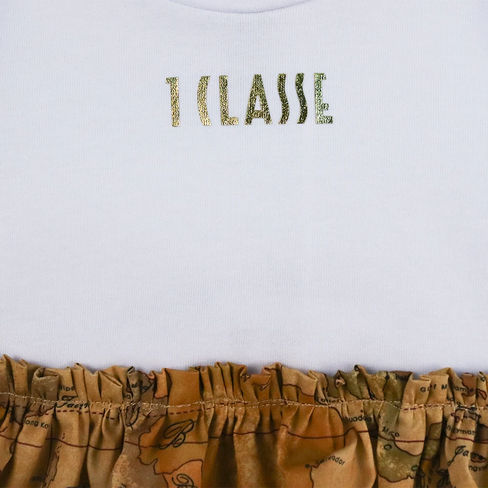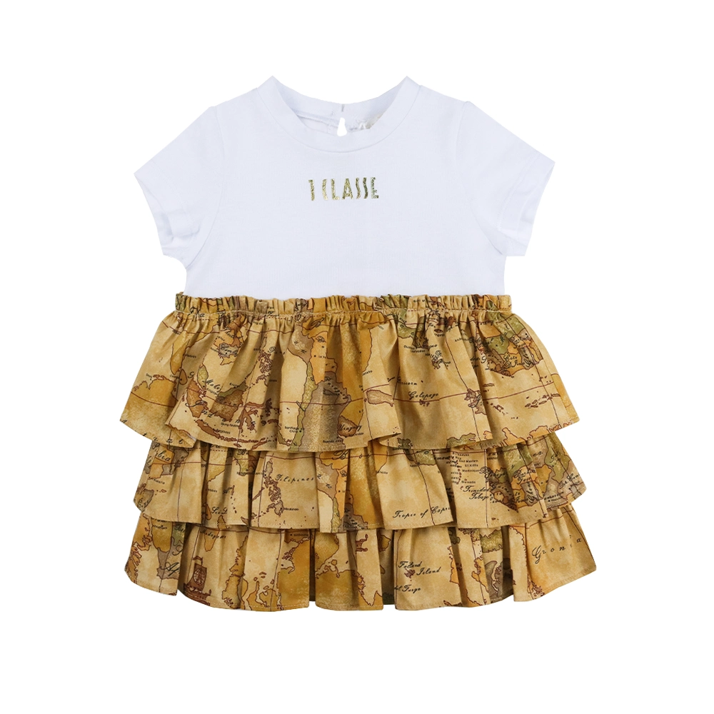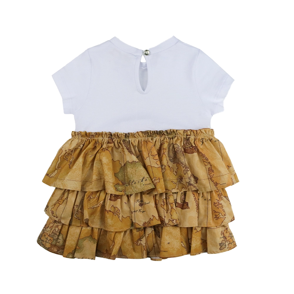 فستان أبيض بأكمام قصيرة بنقشة الخريطة الجغرافية للفتيات