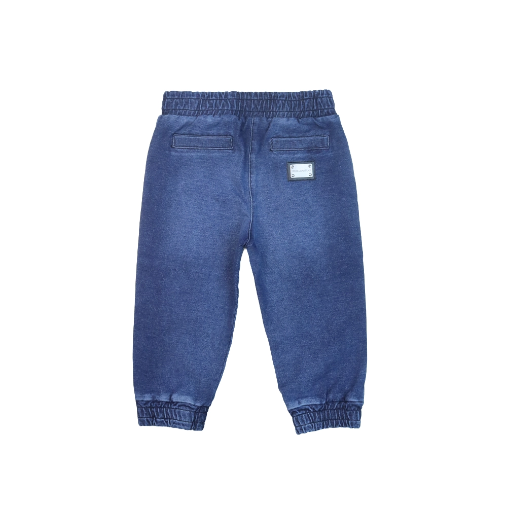 Stylish and comfortable, these blue denim jeans for baby boys by Dolce & Gabbana are perfect for everyday wear. Made from soft stretch denim, they offer flexibility and comfort for active little ones. The design features a distinctive logo patch on one the back, adding a signature designer touch. An adjustable drawstring waistband ensures a secure and comfortable fit, while elasticated ankle cuffs provide a neat, sporty finish. Ideal for pairing with casual tops and sweatshirts for a relaxed yet fashionable look.