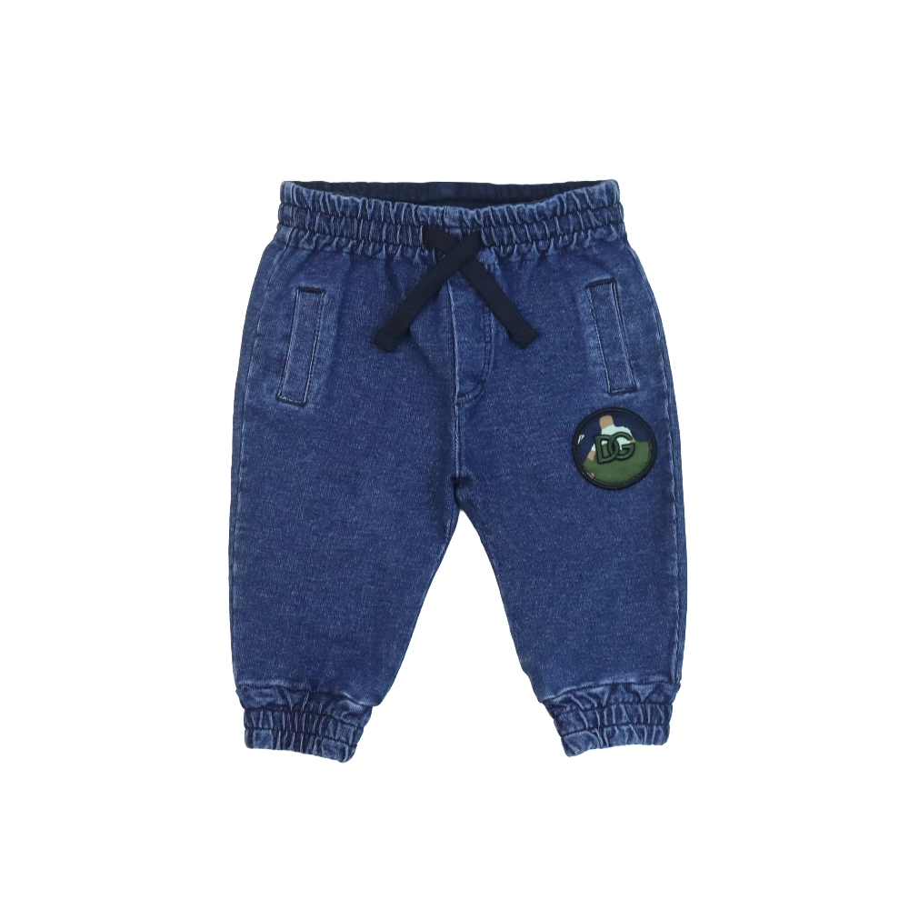 Stylish and comfortable, these blue denim jersey joggers for baby boys by Dolce & Gabbana are perfect for everyday wear. Made from soft stretch denim jersey, they offer flexibility and comfort for active little ones. The design features a distinctive DG camouflage logo patch sewn on one leg, adding a signature designer touch. An adjustable drawstring waistband ensures a secure and comfortable fit, while elasticated ankle cuffs provide a neat, sporty finish. Ideal for pairing with casual tops and sweatshirts for a relaxed yet fashionable look.