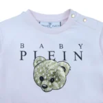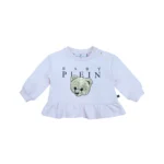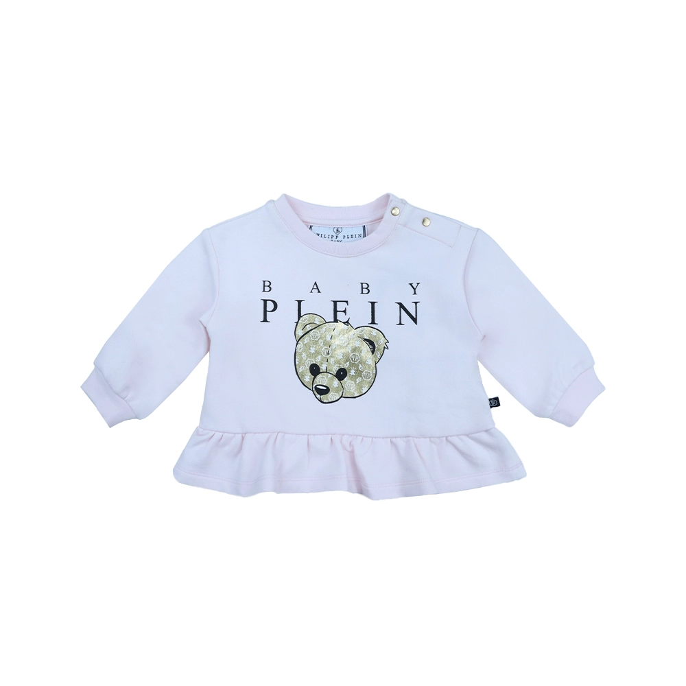 This charming sweatshirt by Philipp Plein is designed in a soft pink shade with a playful teddy bear and logo print on the front. Featuring a classic round neckline and long sleeves, it is finished with a delicate ruffled hem that adds a feminine touch to the casual silhouette. Comfortable and stylish, this sweatshirt is perfect for everyday wear with a fun designer twist.