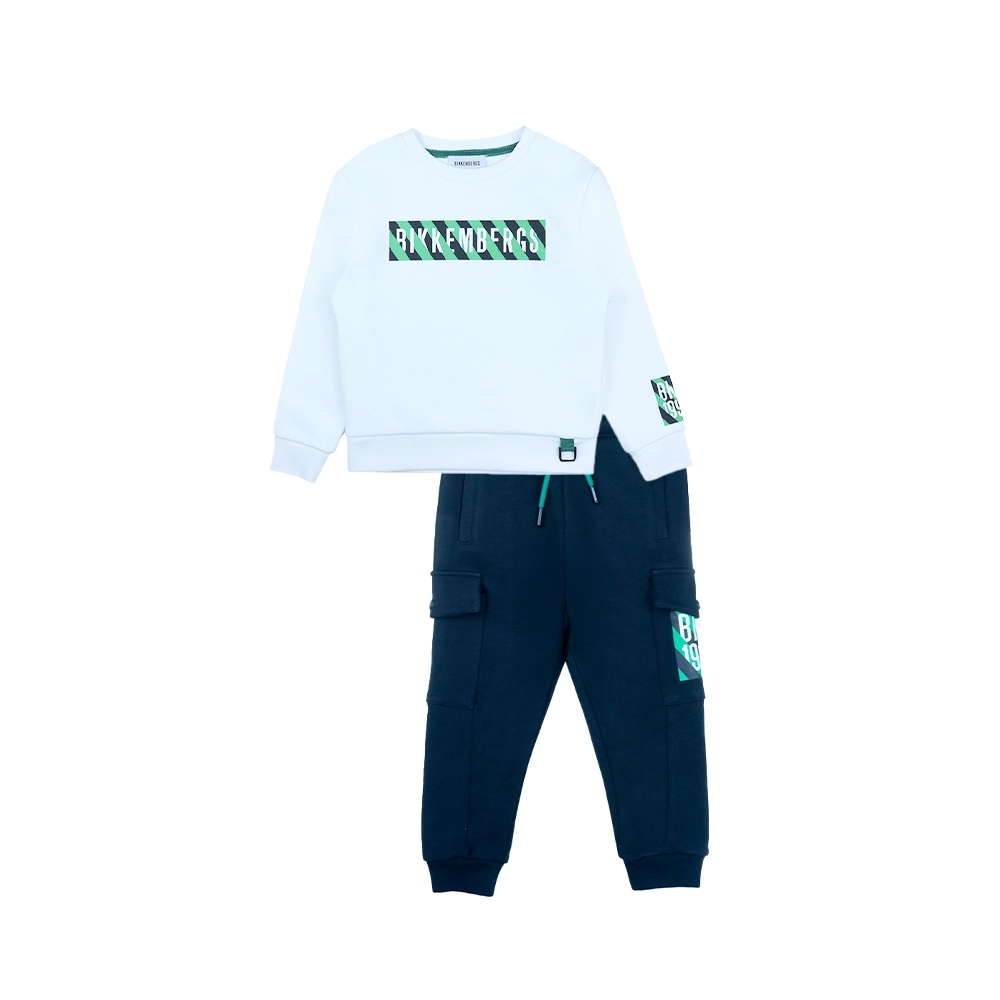 This stylish Bikkembergs 2-piece set is designed for comfort and a sporty, modern look. The T-shirt features a classic round neckline with bold logo prints on the chest and sleeve, adding signature brand appeal. Finished with an elastic band for added comfort. The matching blue cargo joggers complete the look with functional side pockets, an elasticated waistband, and elastic leg cuffs for a secure fit. A logo print on the side pocket adds a distinctive Bikkembergs touch. Ideal for casual outings, playtime, or relaxed days, this set blends practicality with contemporary style.