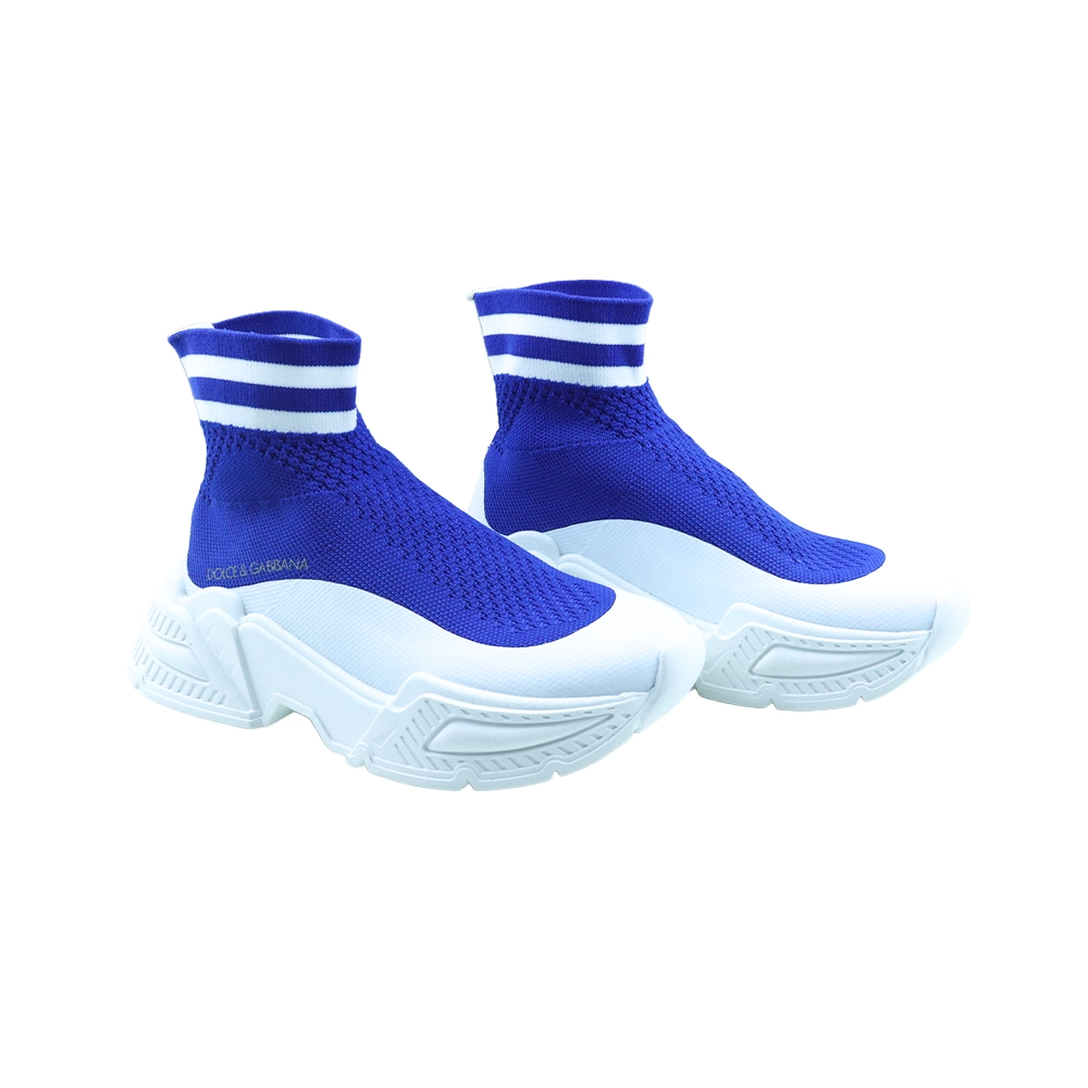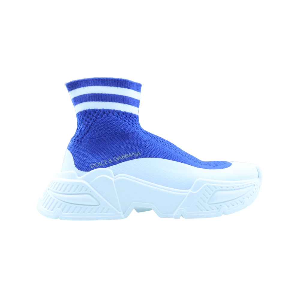 Sporty and eye-catching, these bright blue sock trainers for teen boys by Dolce & Gabbana are inspired by the brand’s dynamic sports collection. Designed in a high-top silhouette, they are crafted from flexible stretch mesh knit for a snug, sock-like fit that offers all-day comfort. The design is accented with white striped trim around the ankle and a light reflective logo print on the sides for a distinctive athletic look. Inside, the leather-lined insole is lightly cushioned to provide added comfort, while the bold rubber outsole is embossed with DG crossover logos, delivering a cool and unmistakable designer finish. Perfect for active days and casual street-style outfits.