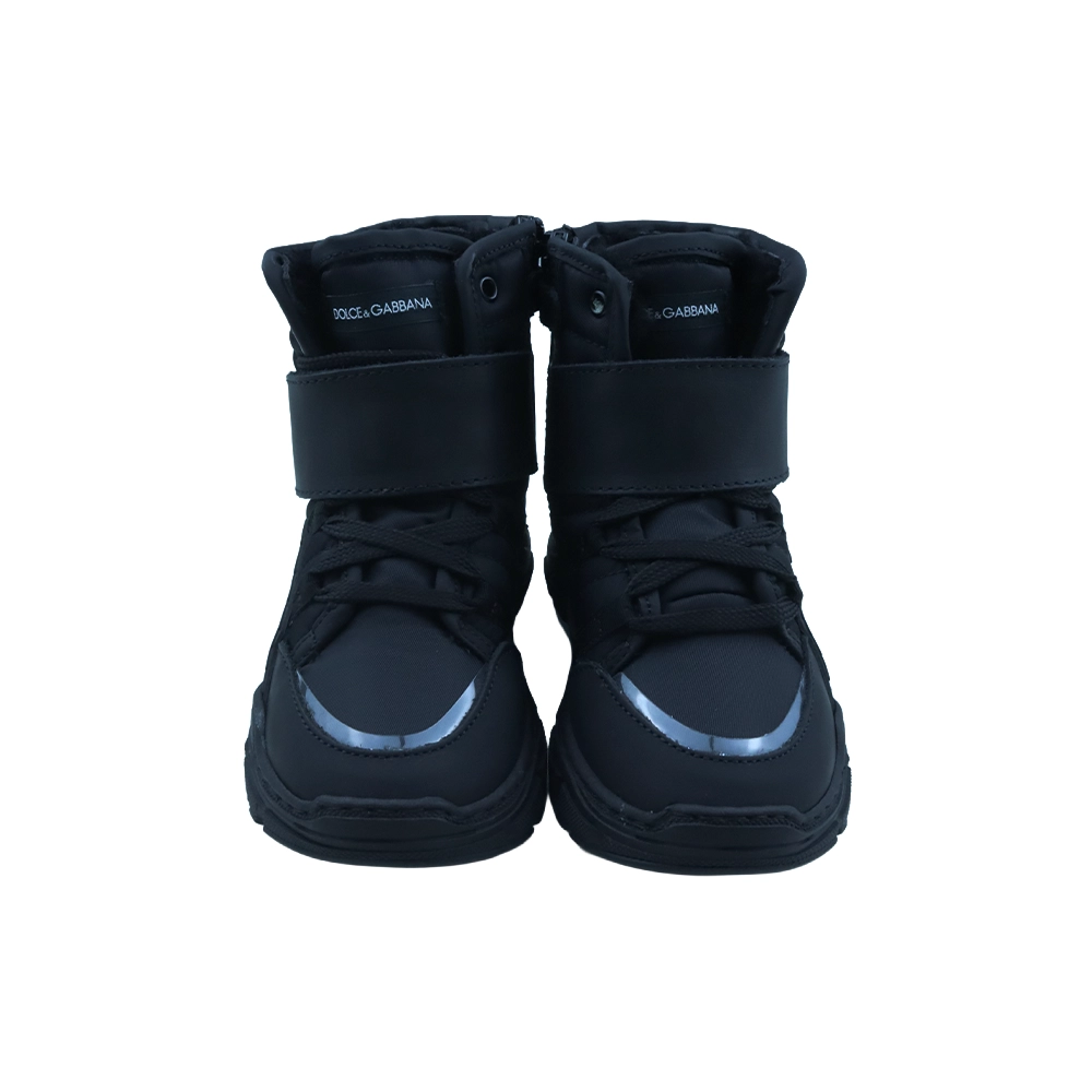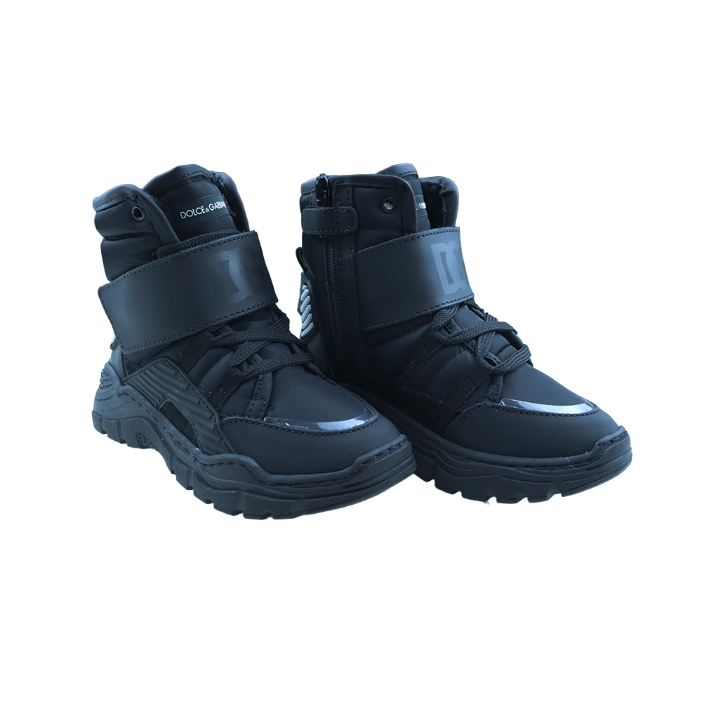The Dolce & Gabbana Daymaster high-top sneakers deliver a distinctive streetwear-inspired look. Expertly crafted from durable nylon with rubber detailing, they combine modern design with everyday comfort. The chunky rubber sole enhances the sporty silhouette while providing reliable grip and support. Inside, a soft furry lining ensures added warmth and comfort. Designed for a secure and adjustable fit, they feature a practical combination of zip, lace-up, and velcro strap closures.