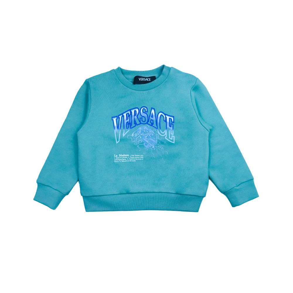 Versace La Medusa Varsity sweatshirt, designed in a refreshing sea green hue with vibrant multicolor accents. Featuring the iconic varsity-style print and signature Medusa motif, this full-sleeve sweatshirt blends luxury with a sporty edge. The classic crew neck and ribbed elastic cuffs provide a structured yet comfortable fit, making it perfect for everyday wear or standout casual styling.