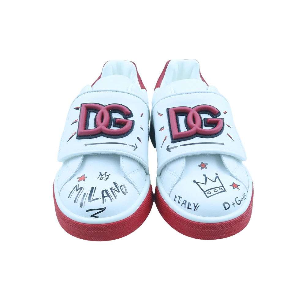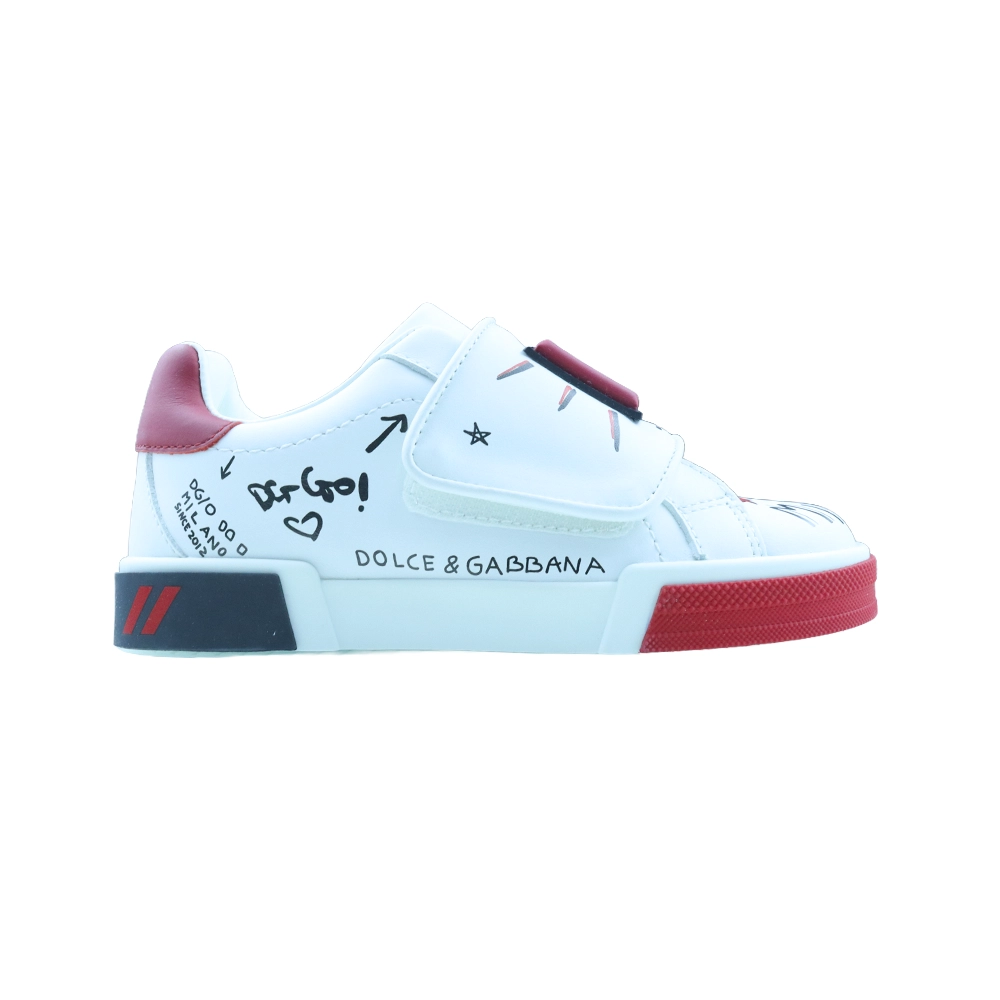 Dolce & Gabbana Portofino sneakers bring a vibrant touch to your young trendsetter’s everyday style. Designed with the brand’s iconic silhouette, these sneakers feature scattered graffiti-inspired motifs that add a fun and laid-back character. Crafted from premium printed calfskin leather, the round-toe design is finished with a practical hook-and-loop (velcro) fastening for easy wear. A micro-injection rubber DG logo enhances the signature look, while the reinforced heel and soft calfskin lining provide added support and comfort. Completed with durable rubber soles and a calfskin footbed with a heat-stamped logo, these sneakers combine luxury craftsmanship with everyday functionality.