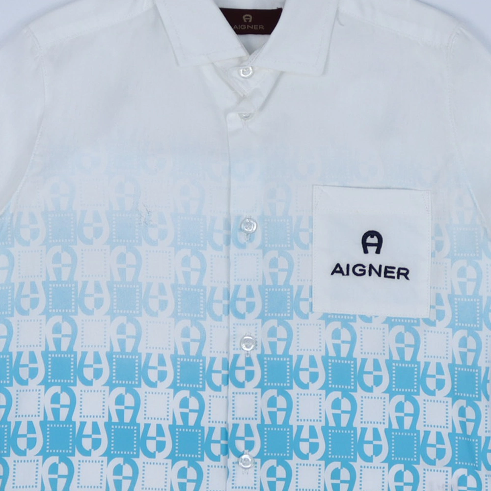 - Stylish white and blue shirt for boys by AIGNER. Made from soft, breathable cotton, this long-sleeved shirt features a striking blue gradient print composed of the brand’s iconic horseshoe ‘A’ logos, creating a modern and eye-catching pattern. A sharp white chest pocket is embroidered with the AIGNER logo, adding a bold designer touch.