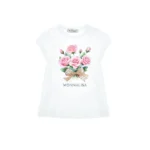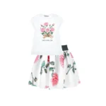 Monnalisa set is a perfect choice for special occasions. The white T-shirt features a delicate rose bouquet graphic with subtle logo detailing, designed with a classic round neckline and cap sleeves for a soft, relaxed silhouette. Paired with a beautifully coordinated skirt, the look is elevated by a charming floral print that adds a romantic touch. The elasticated waistband ensures all-day comfort while maintaining a polished fit. Ideal for parties, celebrations, or dressed-up daytime outings.