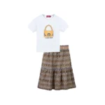 Elegant 2-piece set from AIGNER. Combining comfort with signature luxury style, this coordinated outfit features a soft white short-sleeve T-shirt adorned with the iconic AIGNER handbag logo print in gold tones for a refined statement look. The set is paired with a beautifully patterned flared skirt in warm brown and neutral shades, designed with an elasticated waistband for a comfortable and flexible fit. Perfect for stylish day outings, casual gatherings, or special occasions, this ensemble offers effortless sophistication with a playful touch.