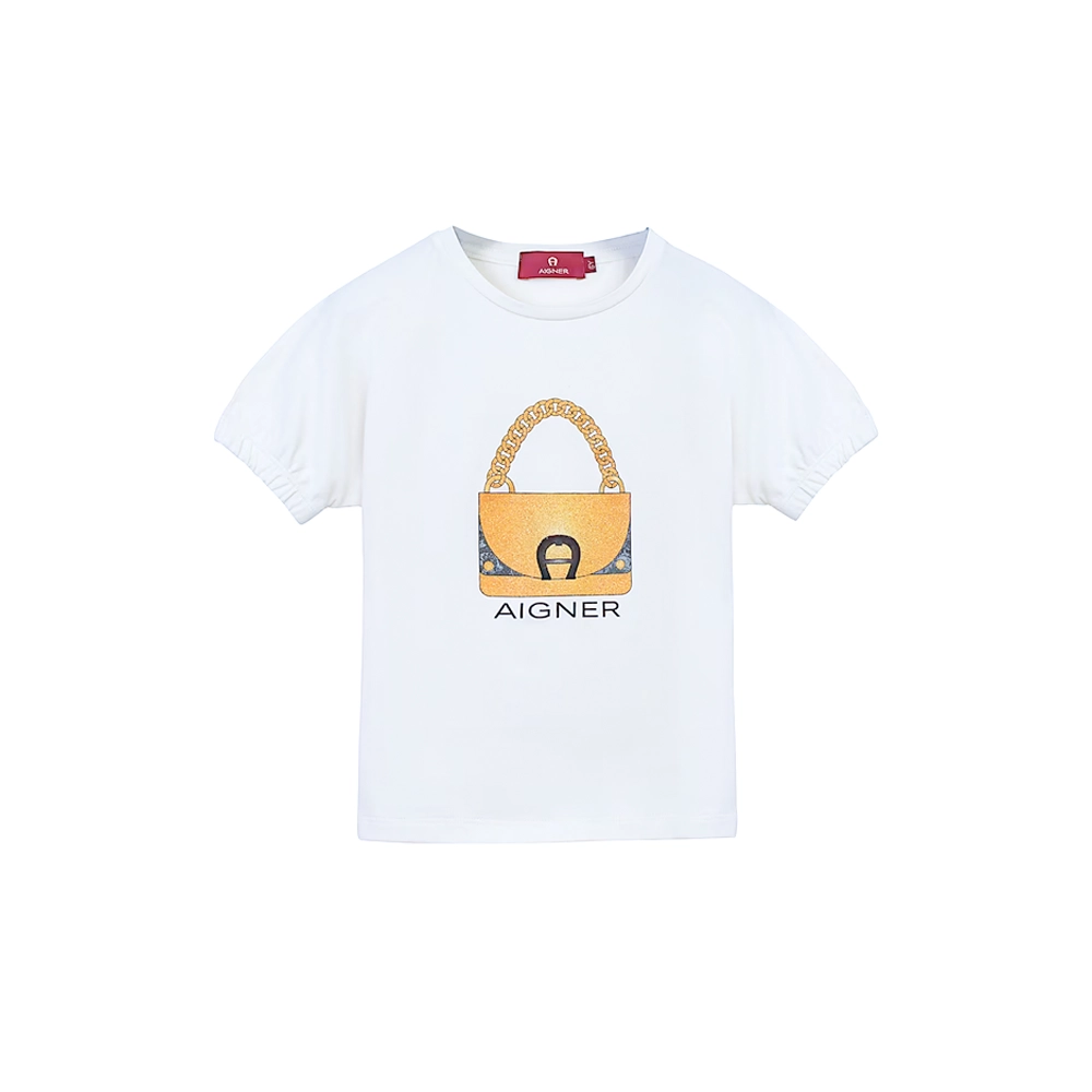 Elegant 2-piece set from AIGNER. Combining comfort with signature luxury style, this coordinated outfit features a soft white short-sleeve T-shirt adorned with the iconic AIGNER handbag logo print in gold tones for a refined statement look. The set is paired with a beautifully patterned flared skirt in warm brown and neutral shades, designed with an elasticated waistband for a comfortable and flexible fit. Perfect for stylish day outings, casual gatherings, or special occasions, this ensemble offers effortless sophistication with a playful touch.