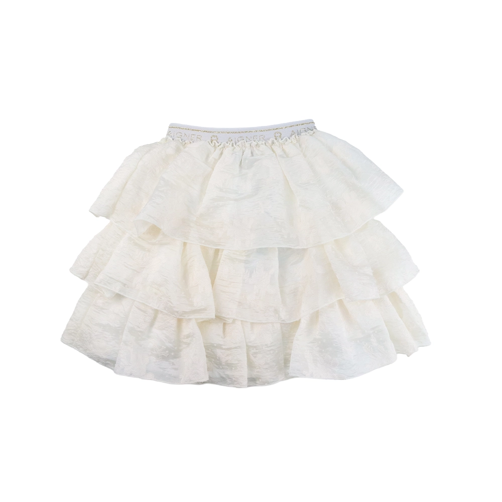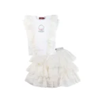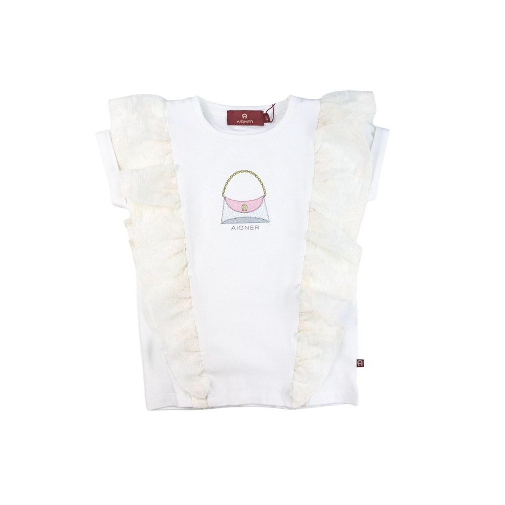 Elegant and effortlessly chic, this Aigner 2-piece set is designed for little girls who love refined style. The soft white top features delicate ruffle detailing along the front and a charming Aigner handbag print at the center, adding a signature luxury touch. Paired with a voluminous tiered skirt crafted in textured fabric, this set creates a graceful silhouette perfect for special occasions, celebrations, and stylish daytime outings.