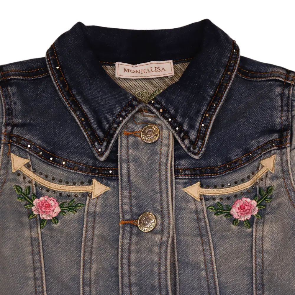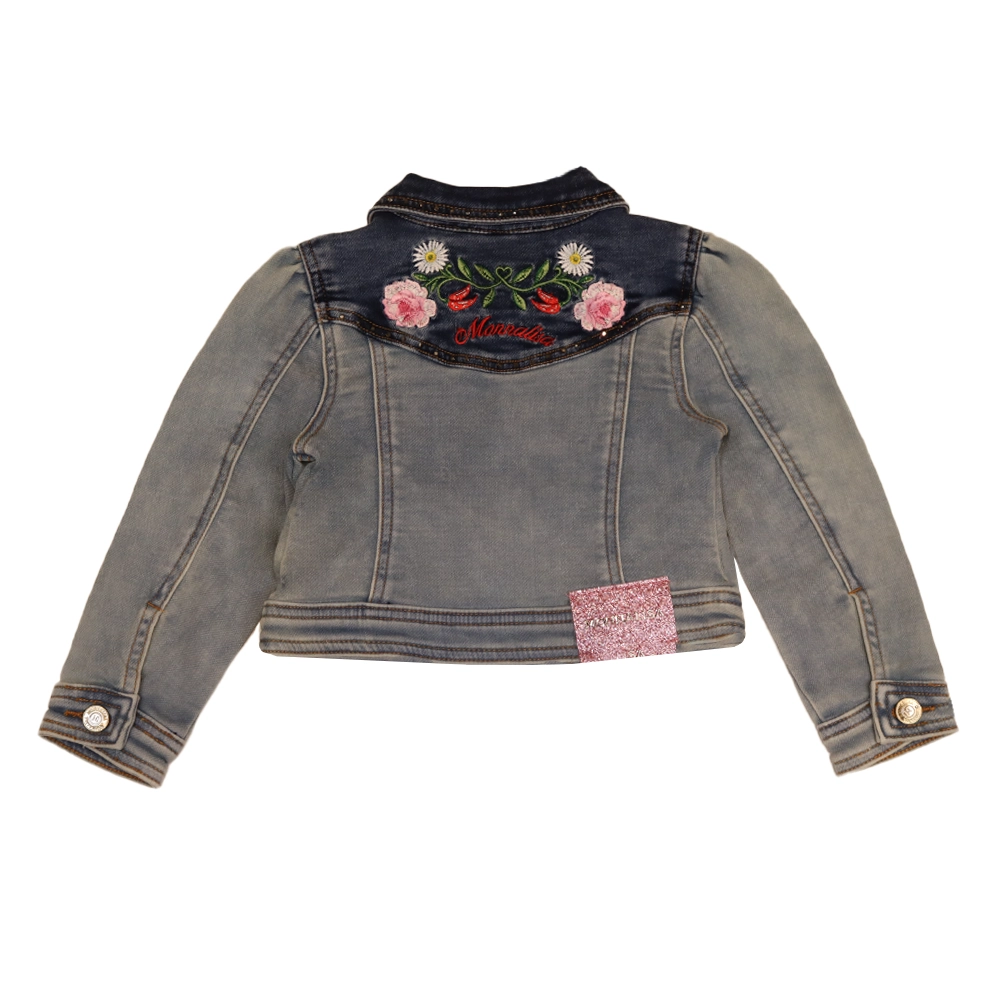 Girls Blue Denim Floral Embroidered Jacket