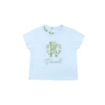 This elegant Roberto Cavalli two-piece set pairs classic simplicity with signature brand flair. The white cotton T-shirt features a refined embroidered logo, short sleeves, a round neckline, and a straight hem for a timeless silhouette. The matching skirt adds a delicate yet distinctive touch to Cavalli’s maximalist style, showcasing an intricate filigree print accented with colorful carousel animals. Finished with a concealed side zip fastening and logo hardware, the skirt offers a polished and comfortable fit. Perfect for stylish outings or special occasions, this set blends luxury, creativity, and effortless charm.