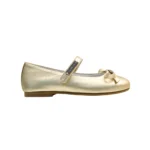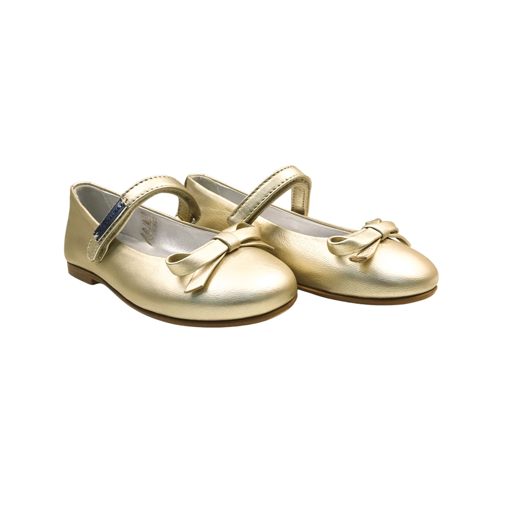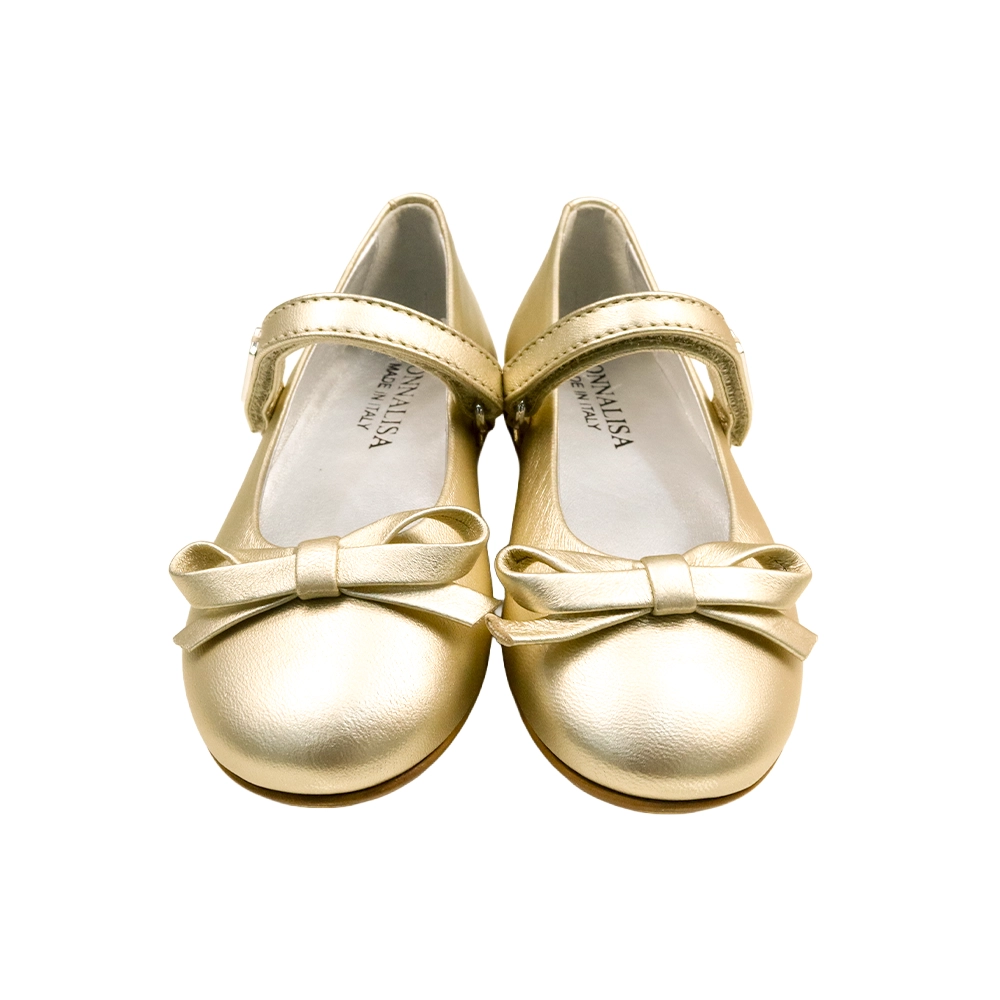 Elegant and timeless, these Monnalisa girls’ ballet flats are designed to add a touch of shine to any outfit. Crafted in soft metallic gold leather, they feature a delicate bow detail on the front for a classic, feminine finish. The adjustable strap ensures a secure and comfortable fit, making them ideal for both special occasions and everyday wear. With their refined silhouette and subtle shimmer, these shoes effortlessly combine style and practicality for a chic spring-summer look.
