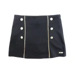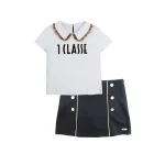 The set includes a black logo-embroidered T-shirt and a matching skirt, both crafted from soft, breathable premium cotton for all-day comfort. The T-shirt features contrast collar trims, front logo embroidery, and a rear button closure, while the skirt is shaped with a stretchy waistband and elastic for unrestricted movement and easy dressing. Ribbed knit details and gold-tone metal hardware add subtle luxury, making this set perfect for casual outings, playdates, or stylish everyday wear.
