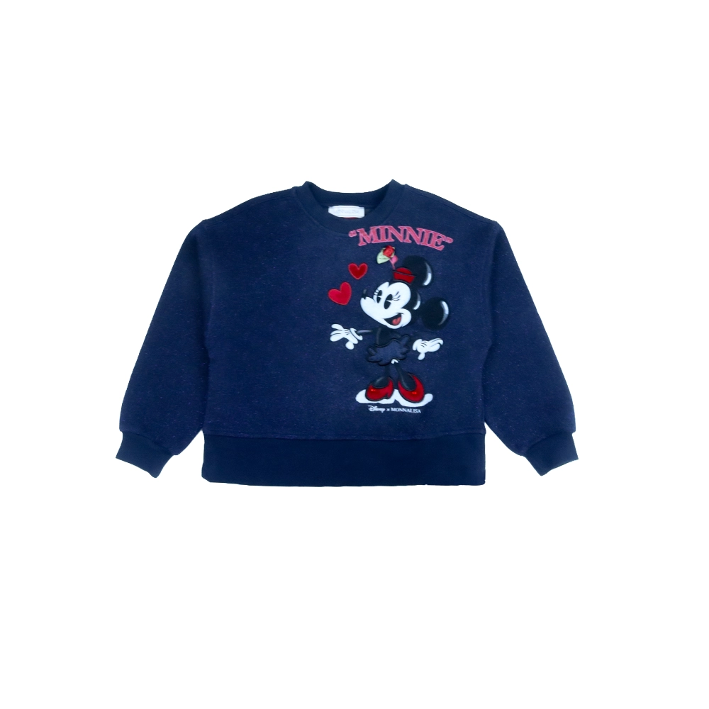 A stylish and playful coordinated set from Monnalisa x Disney, this navy blue outfit brings Minnie Mouse charm into everyday comfort. The sweatshirt features delicate Minnie Mouse embroidery, soft heart motifs, and a feminine back bow detail, all balanced with relaxed dropped shoulders for an easy, modern fit. Paired with matching heart-embellished trousers, the look continues with sparkling crystal accents, an elasticated waistband, and cuffed hems for a snug yet comfortable finish. Side pockets add practicality, making this set perfect for casual days with a touch of magic and sparkle.