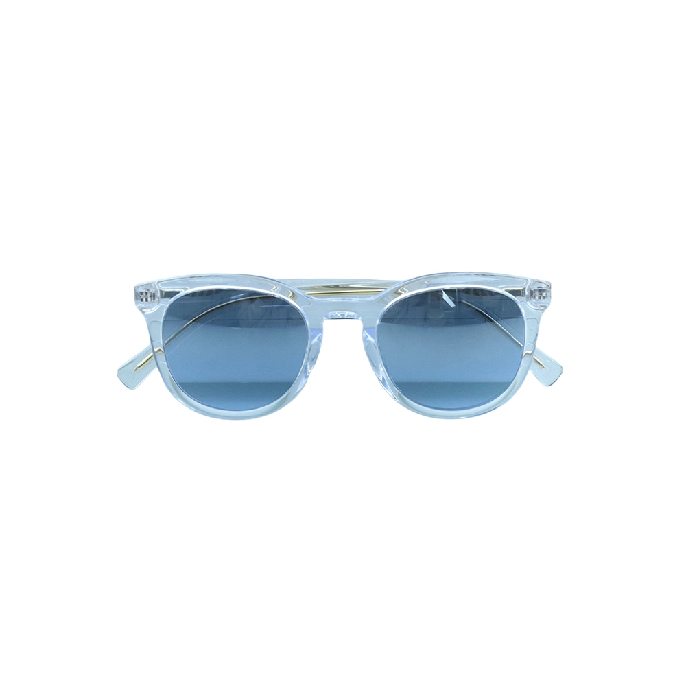 Dolce & Gabbana round-frame sunglasses offer a fresh and modern look. Crafted in Italy from high-quality acetate, the transparent sky-blue frame adds a vibrant and fashionable touch. The design features blue tinted lenses that enhance the sleek aesthetic while providing comfortable sun protection. Finished with straight arms and curved tips for a secure fit, these sunglasses are both practical and eye-catching. They come complete with a protective case, making them perfect for everyday wear or travel.