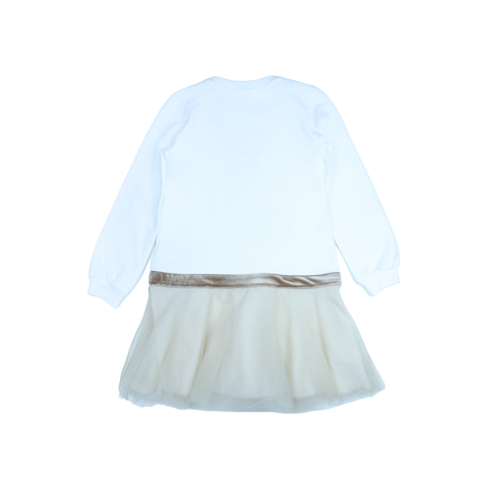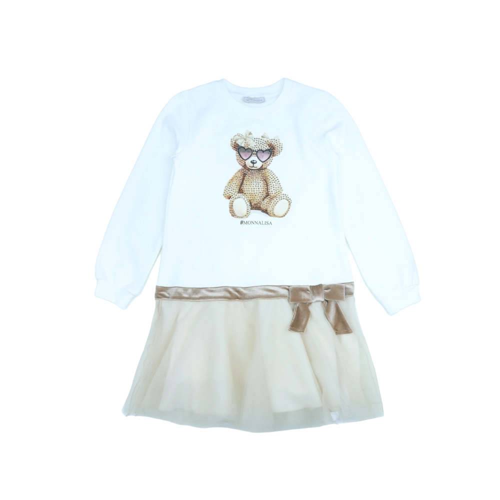 Monnalisa dress in soft ivory and beige is designed to make special moments even more memorable. Crafted from soft cotton with a warm fleecy interior, it ensures all-day comfort while maintaining a refined silhouette. The front features an adorable teddy bear motif embellished with sparkling gold rhinestones, adding a touch of playful luxury. A layered tulle skirt enhances the dress with soft volume and movement, while the velvety bow waistband beautifully defines the waist for a graceful finish.