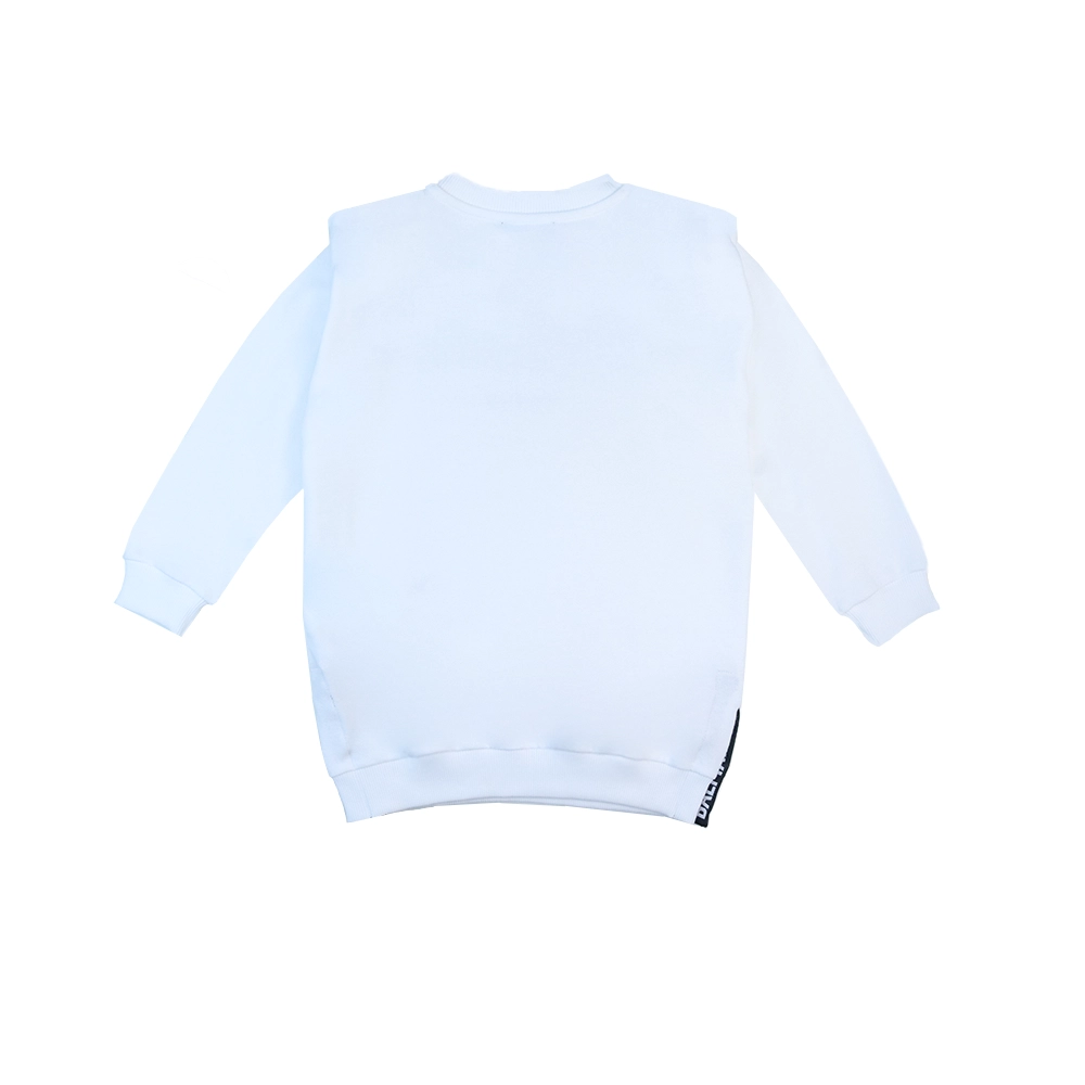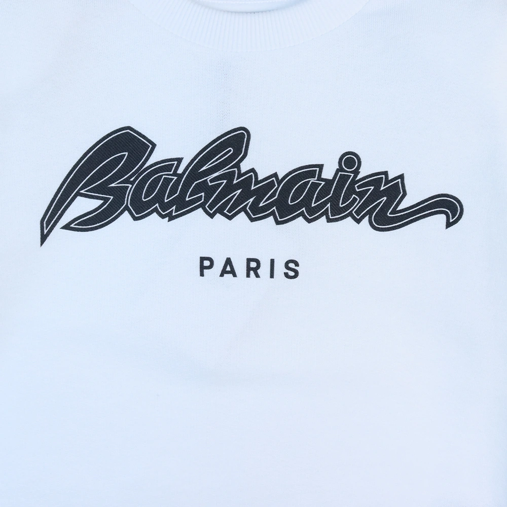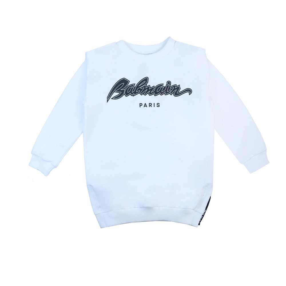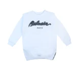 Make a bold style statement with this Balmain Teen Girls White Sweatshirt Dress, crafted from soft, mid-weight cotton jersey for premium comfort. Designed by the iconic luxury fashion house, this chic dress features a striking black rubberised Balmain signature logo across the chest, adding a modern and elevated touch. The standout detail is its padded, structured shoulders, enhanced with elegant pleating to create a strong, fashion-forward silhouette. Perfect for everyday luxury, special outings, or styling with trend-led accessories.