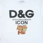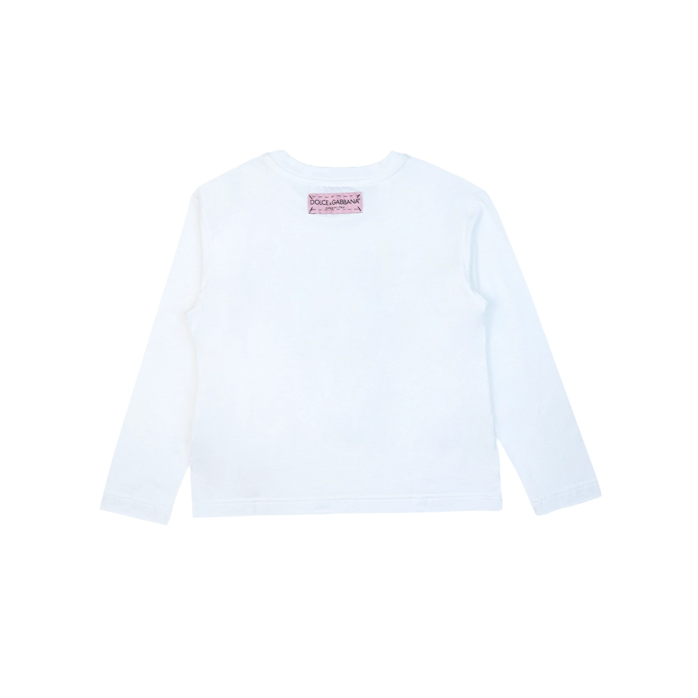 Sweet and playful, this white t-shirt for baby girls by Dolce & Gabbana adds a charming designer touch to everyday dressing. Crafted from soft and breathable cotton jersey, it ensures all-day comfort for delicate skin. The front is decorated with a bold red and gold ‘look at me’ slogan print, complemented by a subtle logo tab for a signature finish. Perfect for pairing with leggings, skirts, or jeans, this stylish piece brings fun personality to your little one’s wardrobe.