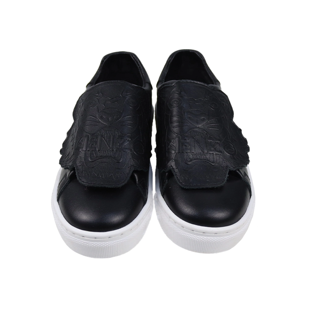 Kids Black Leather Tiger Print Slip-on Sneakers