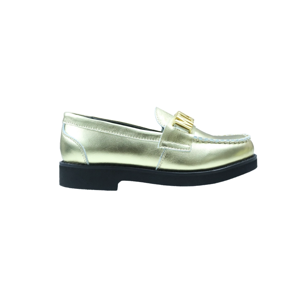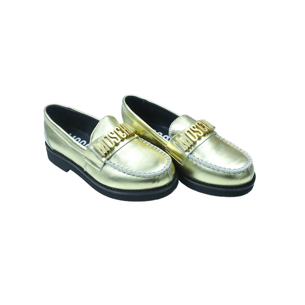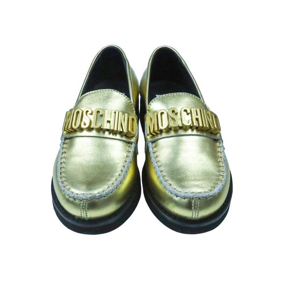 Make a bold style statement with these Moschino Kids leather loafers. Crafted from metallic gold-tone leather, this eye-catching pair features a signature Moschino logo plaque across the front for instant designer appeal. Designed with classic moccasin-style stitching, a round toe silhouette, and a comfortable slip-on fit, they are finished with a sturdy rubber sole for everyday wear. Perfect for special occasions or adding a touch of luxury to smart-casual outfits.