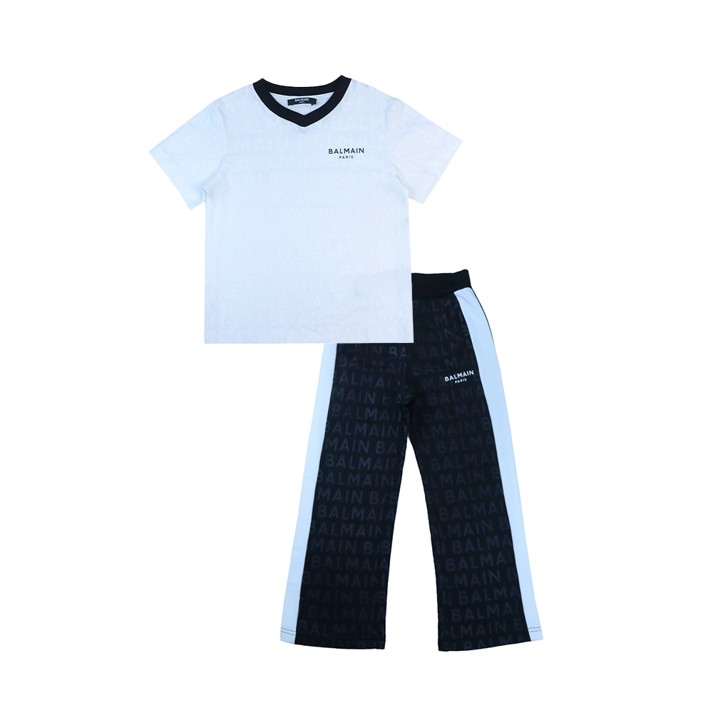 Bring iconic luxury to your child’s wardrobe with this Balmain Kids 2-Piece Monogram Set, combining effortless comfort with unmistakable designer style. The premium cotton monogram-print T-shirt features Balmain’s signature lettering and a chic V-neckline. Paired with the matching black wide-leg trousers, crafted from a silky-soft viscose jersey and finished with an elasticated waistband for all-day comfort. White popper fastenings along the outer seams add a sporty, fashion-forward touch, while the all-over Balmain branding completes the luxury designer aesthetic.