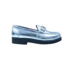 Make a bold style statement with these Moschino Kids leather loafers. Crafted from metallic silver-tone leather, this eye-catching pair features a signature Moschino logo plaque across the front for instant designer appeal. Designed with classic moccasin-style stitching, a round toe silhouette, and a comfortable slip-on fit, they are finished with a sturdy rubber sole for everyday wear. Perfect for special occasions or adding a touch of luxury to smart-casual outfits.