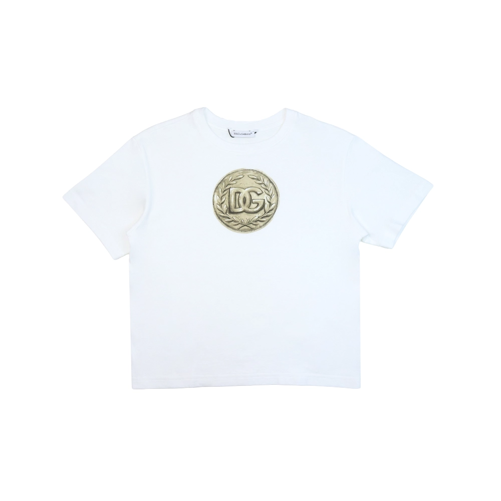 This Dolce & Gabbana T-shirt brings a touch of heritage style to your little one’s wardrobe. Crafted in Italy from soft cotton, it offers breathable comfort for everyday wear. The classic design features a versatile crew neckline, short sleeves, and a straight hem for easy styling. A bold coin-motif logo print on the front adds a distinctive statement, reflecting the brand’s iconic aesthetic and rich inspiration.