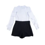 This two-tone mini dress combines classic tailoring with contemporary style. The dress features a crisp white top with long sleeves and a high collar, complete with a single button closure at the neckline for a polished finish. The contrasting black skirt creates a sleek, layered look with a distinctive asymmetrical hemline that adds movement and edge. Perfect for both day-to-night wear, this piece blends the elegance of a shirt dress with the sophistication of modern minimalism.